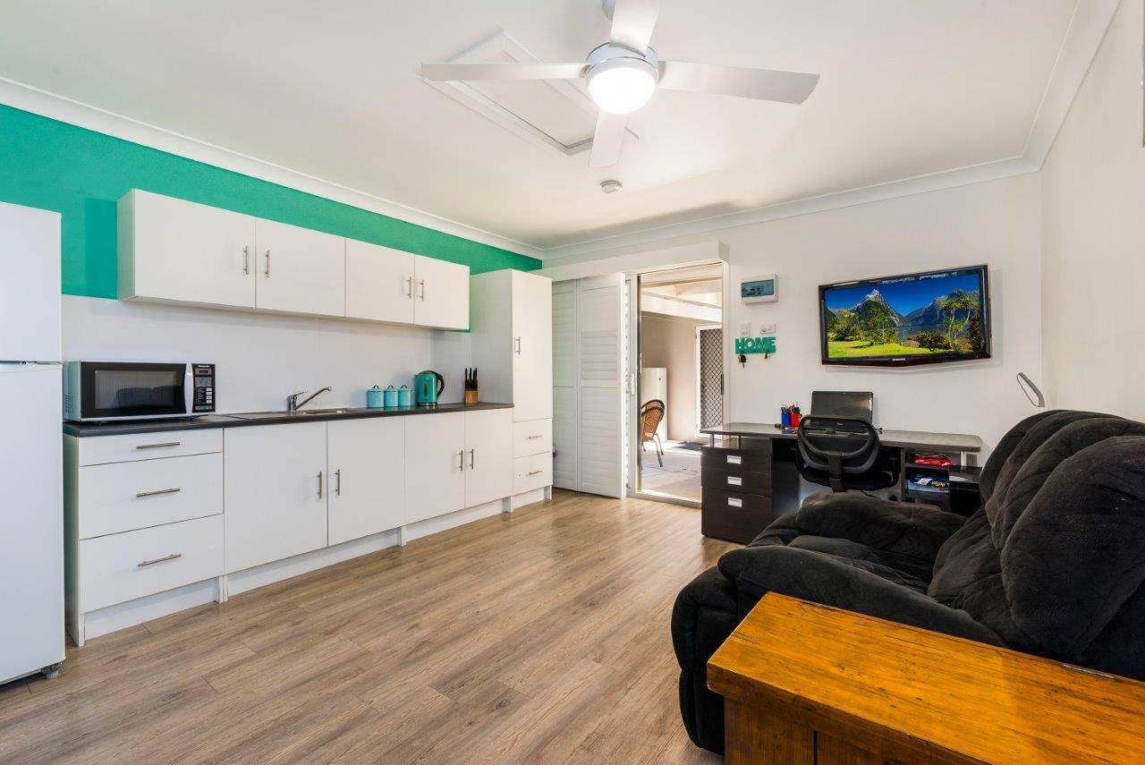 • Large open-plan kitchenette and living area with ceiling fans, fantastic option for a home-based business or office