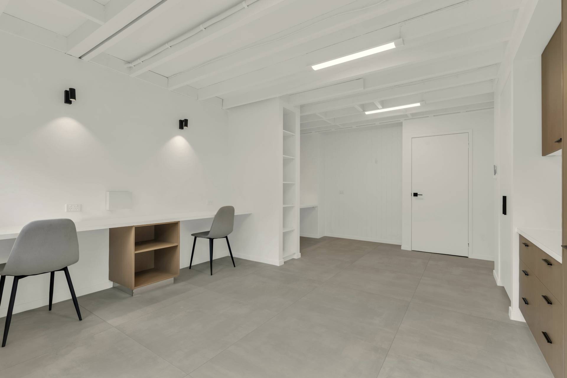 • Large and separate air-conditioned office with custom cabinetry, under stair storage, built-in desks and separate entrance