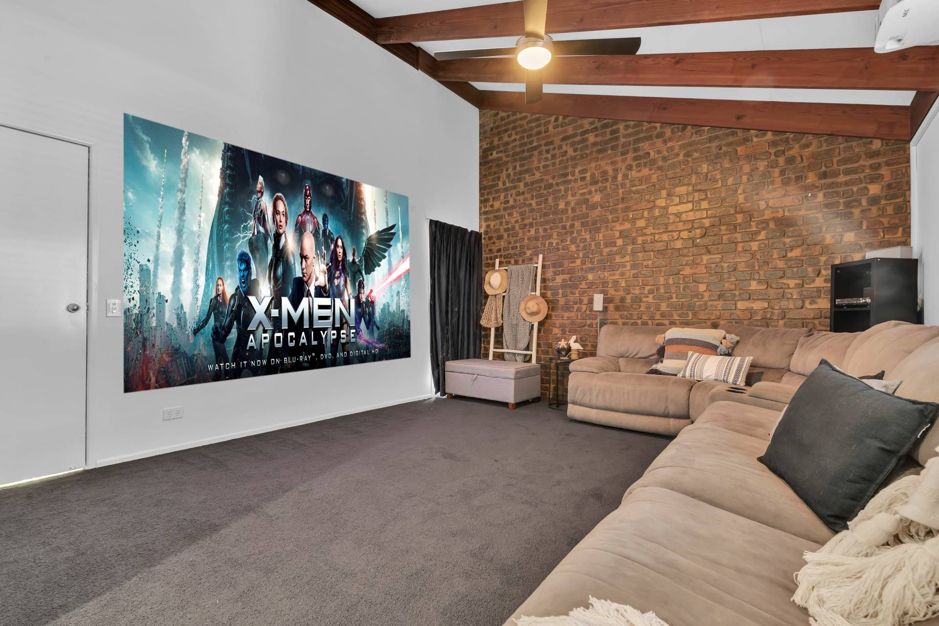 • Spacious and separate media room with vaulted ceilings, exposed beams, and roof-mounted projector