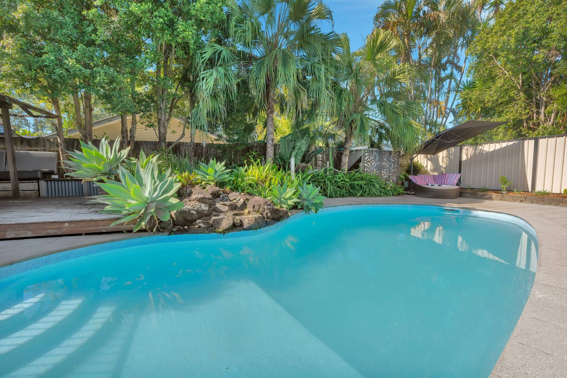 • Sparkling inground pool with glass balustrading and resort style surrounds including rock waterfall, tropical gardens, and large deck area with pool pavilion and spa/hot tub