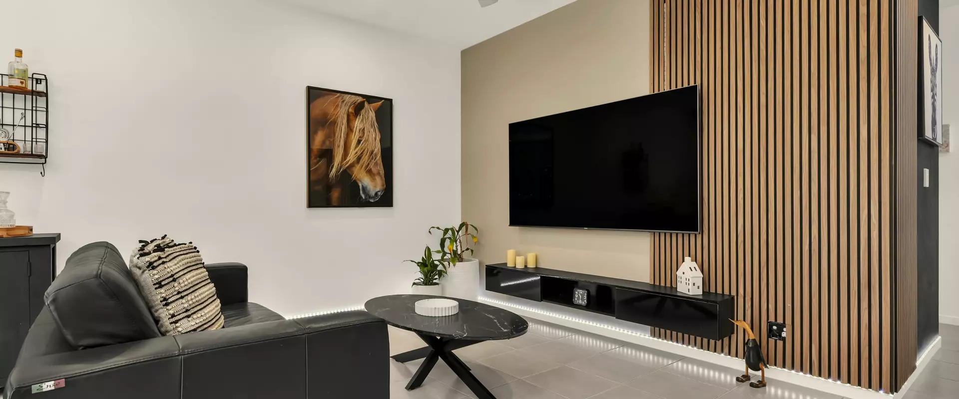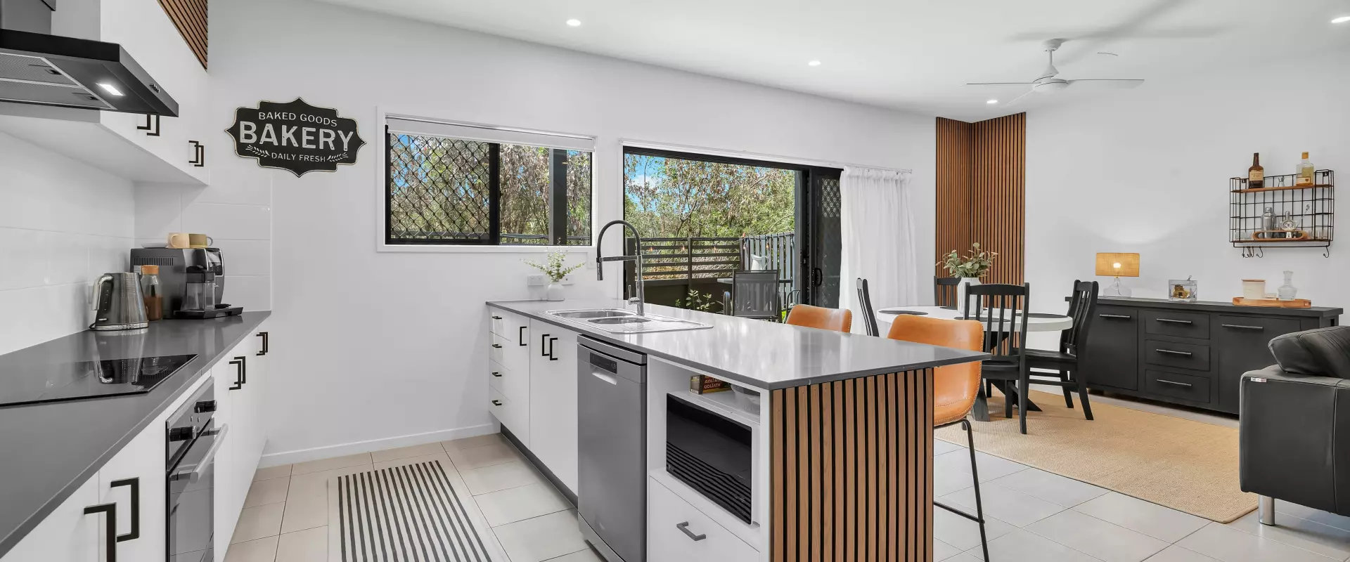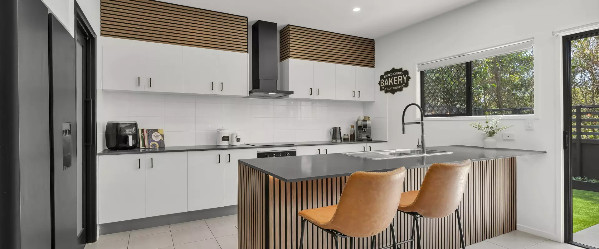 • Superb open-plan kitchen, dining and main living area with 9-foot ceilings and feature wall panelling