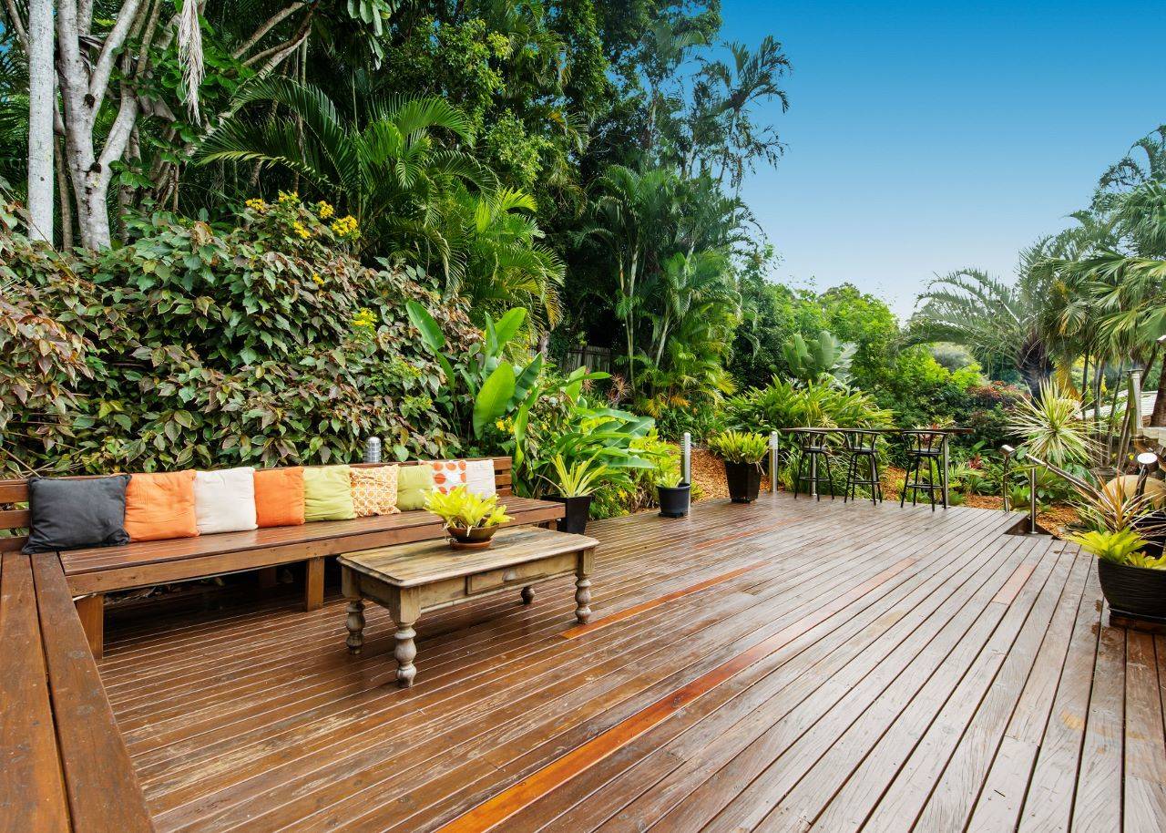 • Additional private outdoor entertaining deck with fixed bench seating, natural timber bar table and peaceful garden outlook