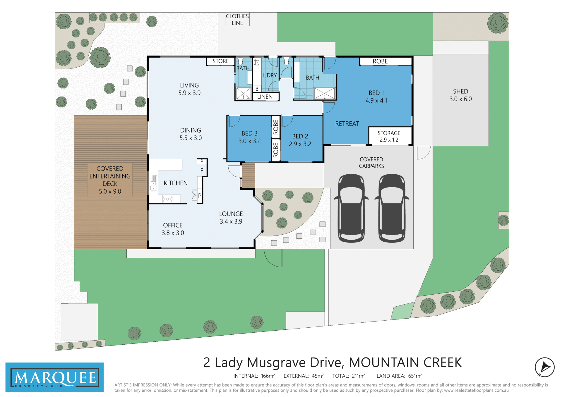 • Quarter garage storage and large 6 x 3m tradesmans shed with lighting and power