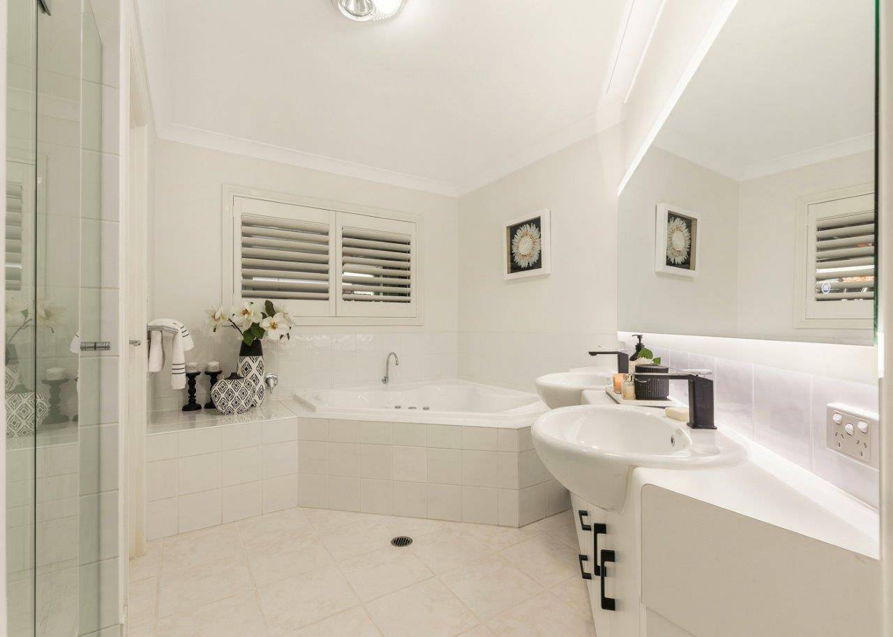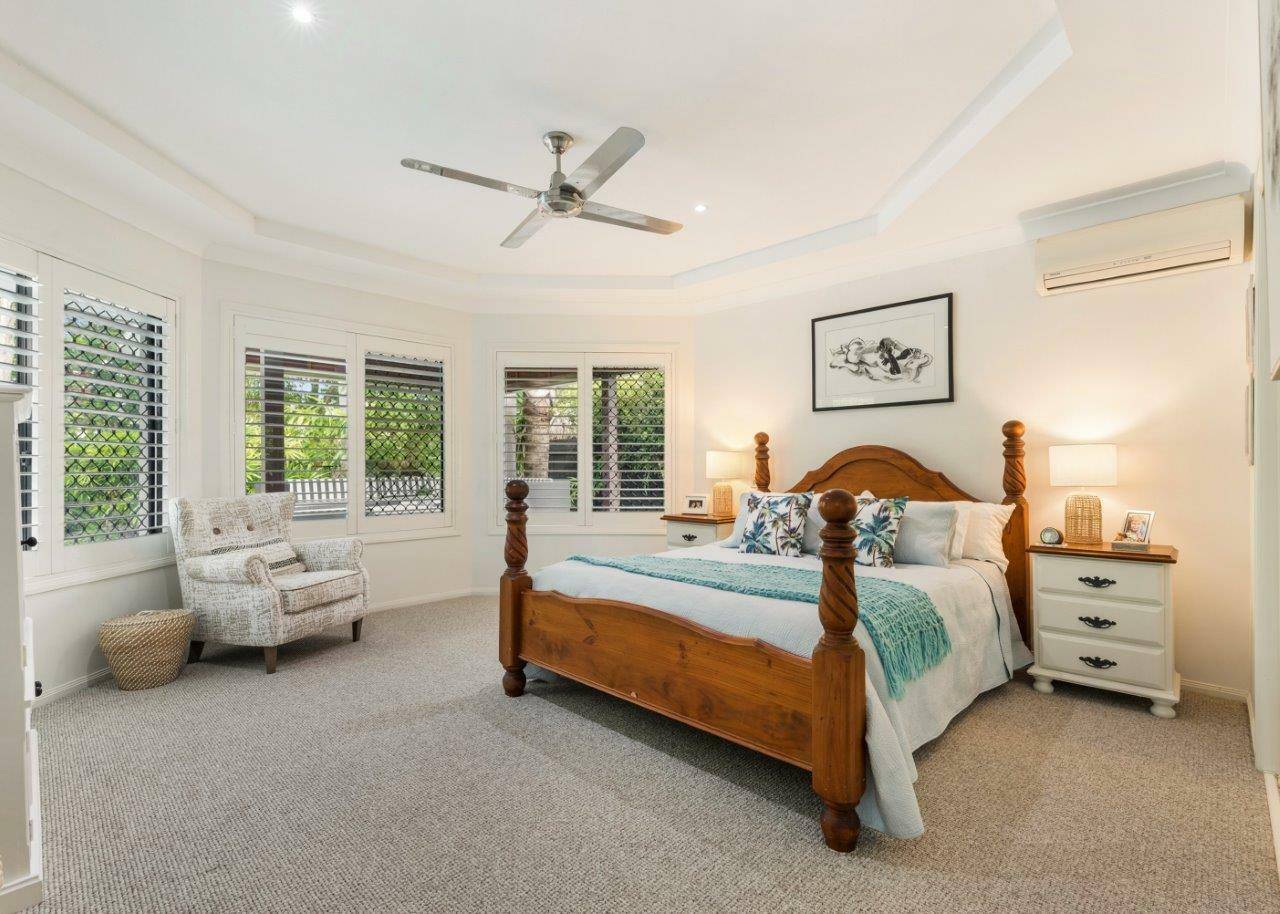 • Magnificent main bedroom located on a separate wing overlooks the pool and tropical gardens through stylish plantation shutters. Includes air-conditioning, feature raised ceiling, large walk-in robe and huge ensuite with spa bath
